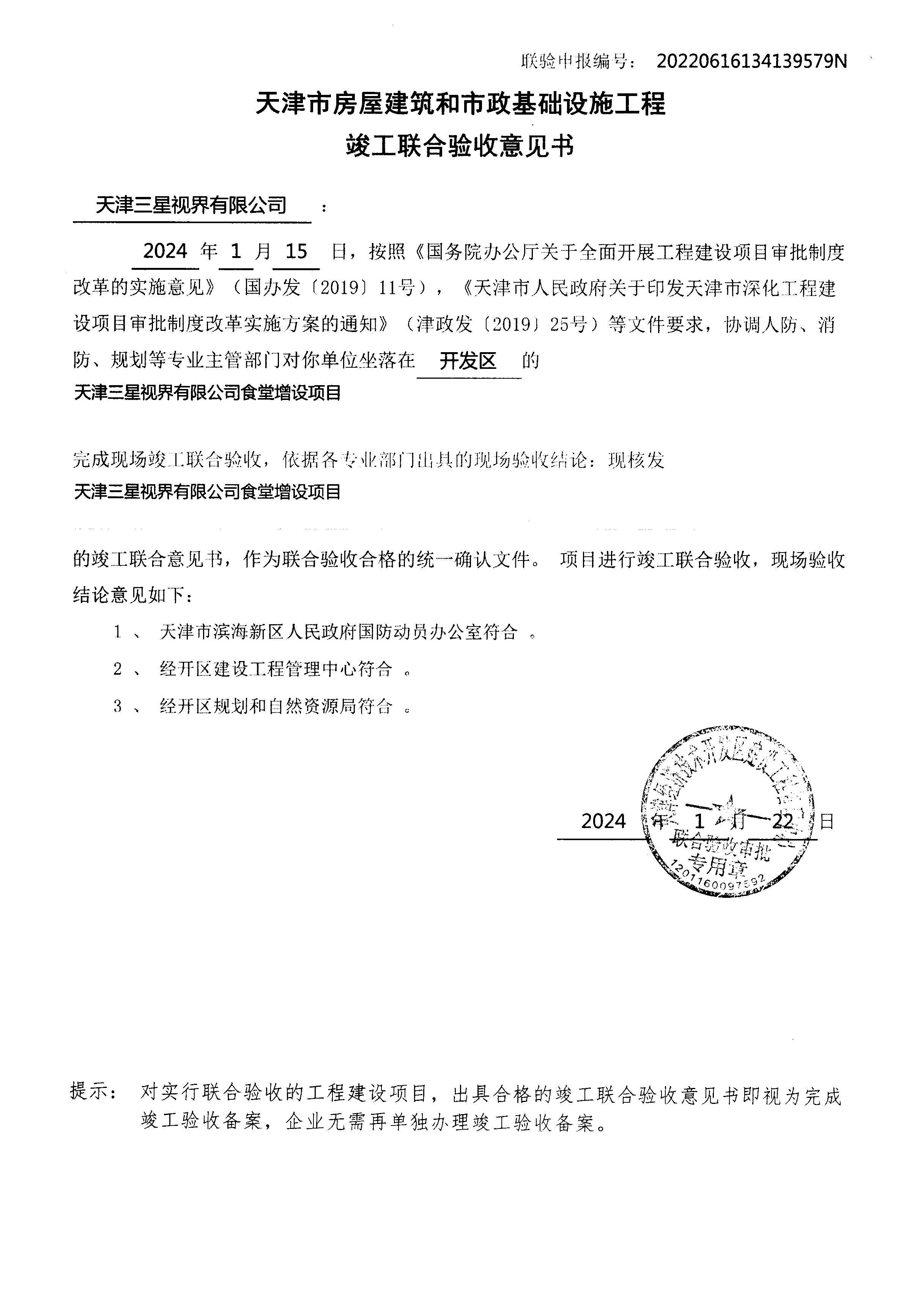 天津市房屋建筑和市政基础设施工程竣工联合验收意见书(天津三星视界有限公司食堂增设项目)