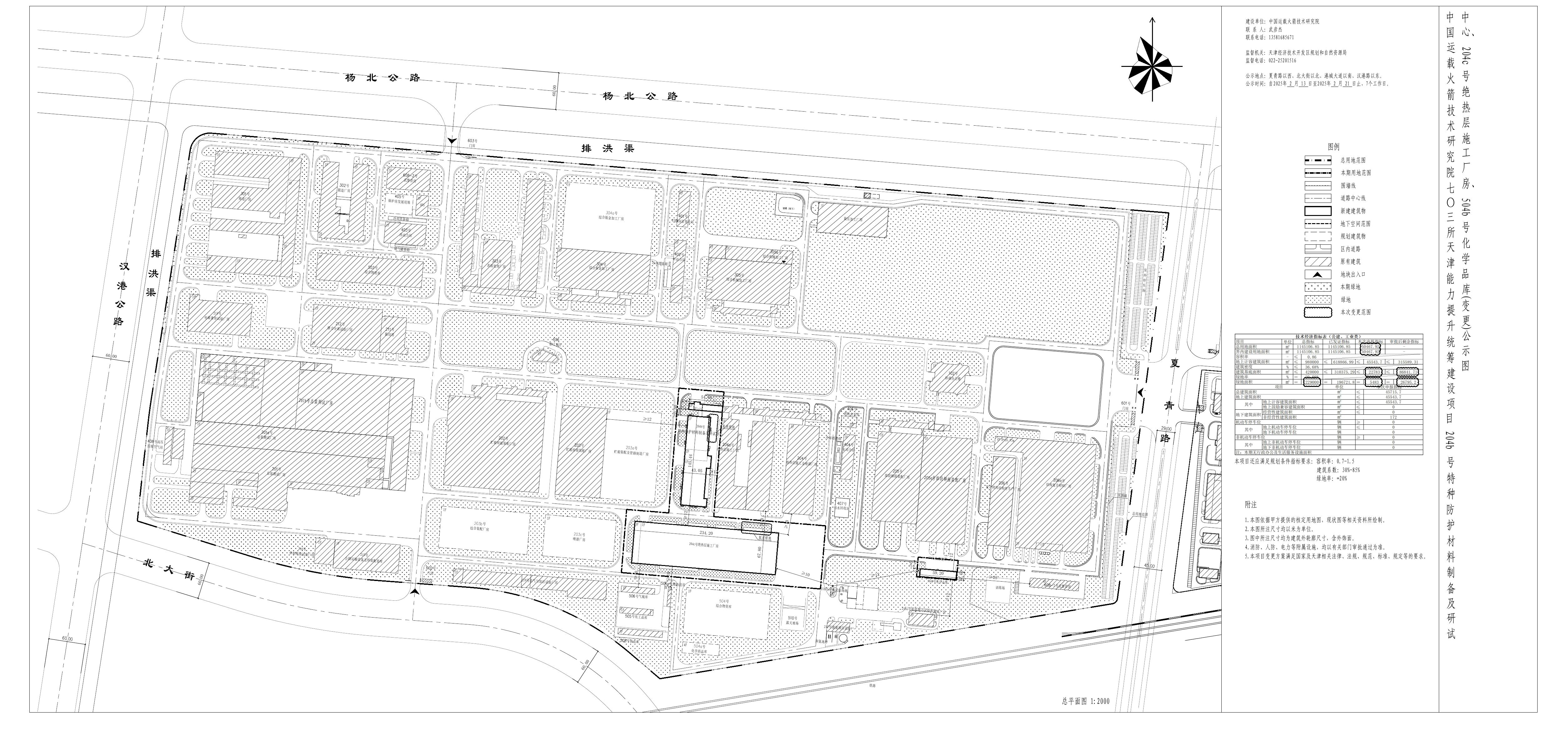 名称:中国运载火箭技术研究院七〇三所天津能力统筹建设项目204b号特种防护材料制备及研试中心、204c号绝热层施工厂房、504b号化学品库(变更)方案公示
