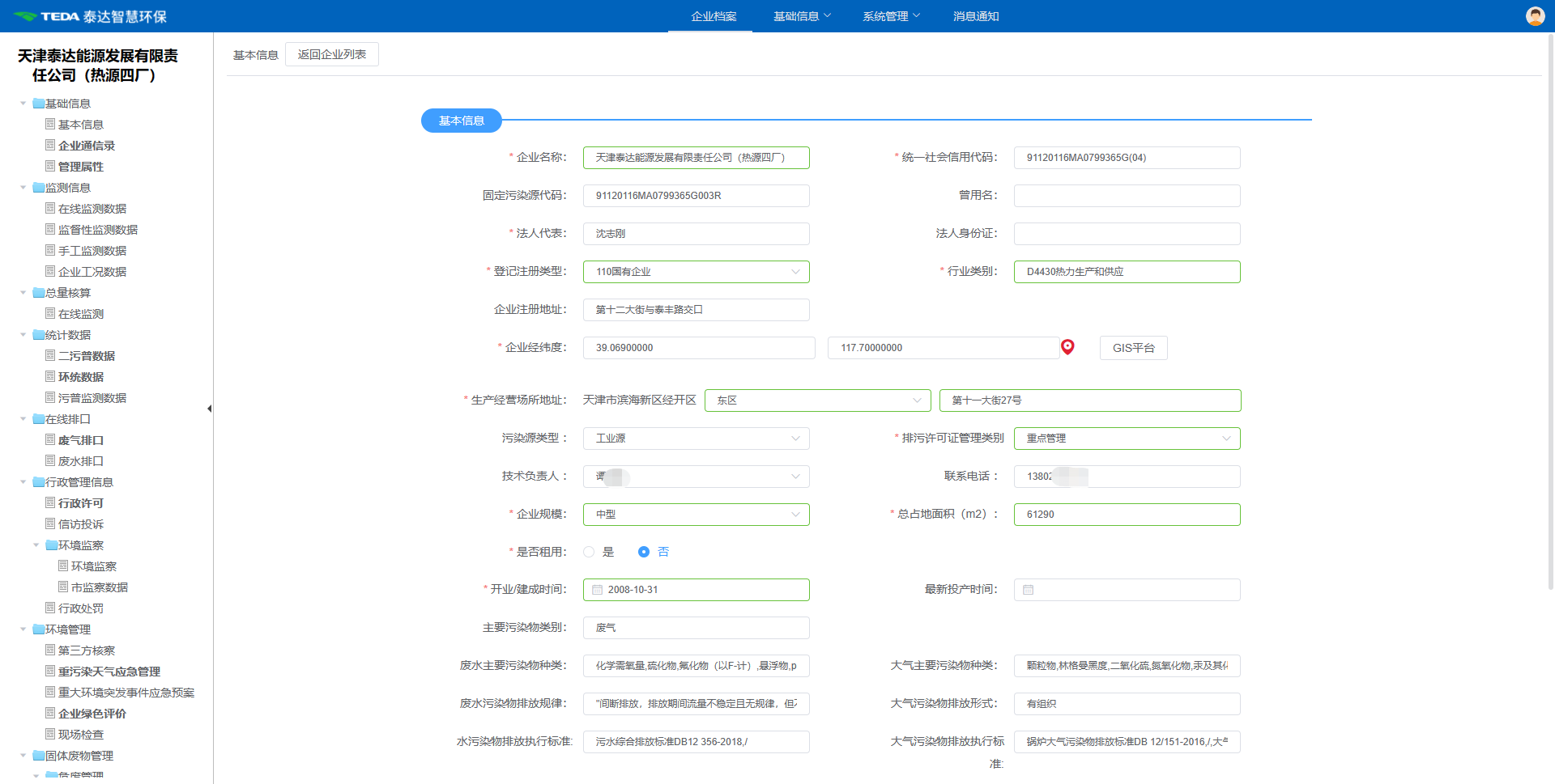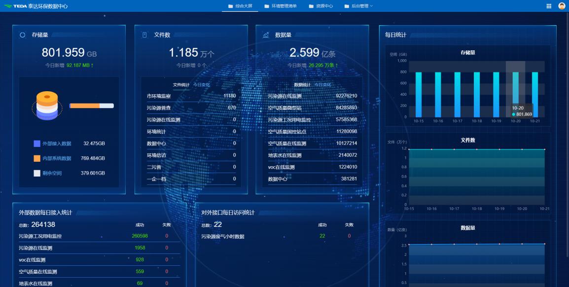 2020年底,天津经开区以“少填报,负担轻;易统计,底账清”为设计原则,完成了泰达智慧环保平台的全面升级。将企业环境管理数据在虚拟空间中完成映射,从而反映企业全生命周期环境管理过程,系统整合积累各类环保数据4500亿条,文件档案1.8万个,数据量近1TB。