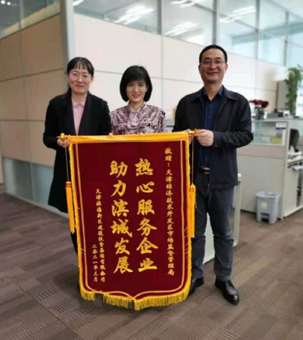 2021年3月15日,天津滨海新区建设投资集团有限公司将“热心服务企业,助力滨城发展”的锦旗送到市场监管局,同时在泰达政务网上发表感谢信,感谢市场监管局在企业发展过程中给予的倾心服务和大力支持。