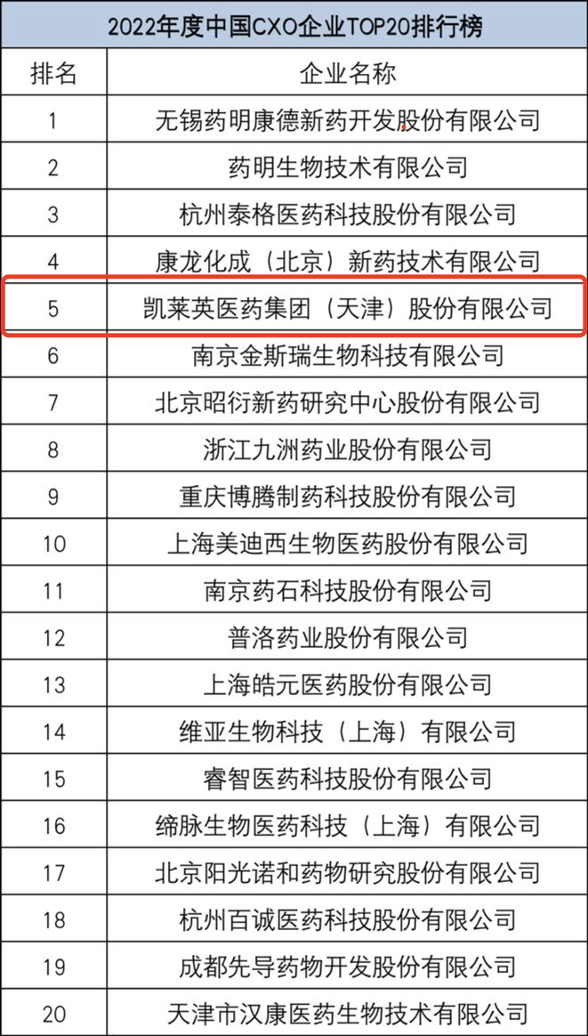 “2022年度中国医药工业百强系列榜单”分为中国化药企业TOP100排行榜、中国中药企业TOP100排行榜、中国CXO企业TOP20排行榜、中国医疗器械(含IVD)企业TOP20排行榜、中国生物医药(含血液制品、疫苗、胰岛素等)企业TOP20排行榜5大系列榜单。其中,经开区企业凯莱英医药集团(天津)股份有限公司上榜“中国CXO企业TOP20排行榜”。