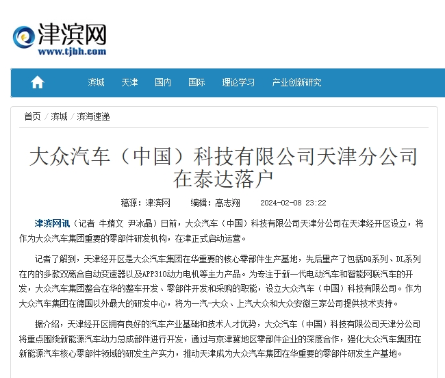 日前,大众汽车(中国)科技有限公司天津分公司在天津经开区设立,将作为大众汽车集团重要的零部件研发机构,在津正式启动运营。
