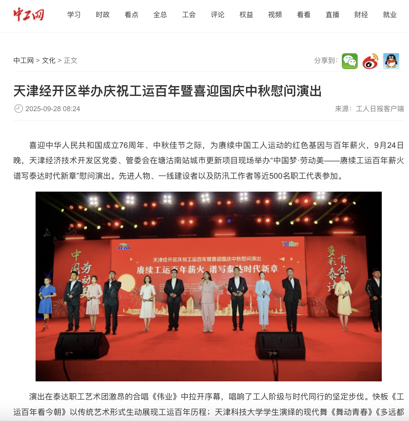 喜迎中华人民共和国成立76周年、中秋佳节之际,为赓续中国工人运动的红色基因与百年薪火,9月24日晚,天津经济技术开发区党委、管委会在塘沽南站城市更新项目现场举办“中国梦·劳动美——赓续工运百年薪火谱写泰达时代新章”慰问演出。先进人物、一线建设者以及防汛工作者等近500名职工代表参加。