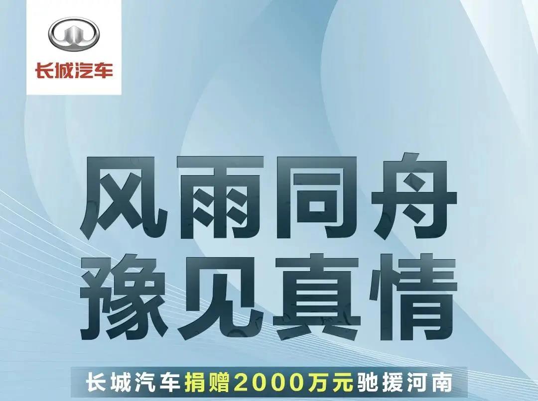 长城汽车捐赠2000万元人民币驰援河南,其中1000万元赠予河南慈善总会,用于紧急救灾和灾后恢复工作;1000万元专项资金用于用户受损车辆的救援、检测、维修。目前,长城汽车旗下哈弗、WEY、长城皮卡、欧拉、坦克五大品牌,已开启用户紧急救援服务通道,旗下各门店正全力配合抢险救灾工作。