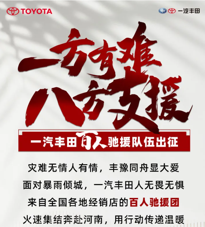 一汽丰田河南地区35家经销店和3家分店派出了近千人的救援队伍。全国各区经销勠力同心,开启了向河南经销店输送物资的行动,为救援受灾客户提供重要支持。