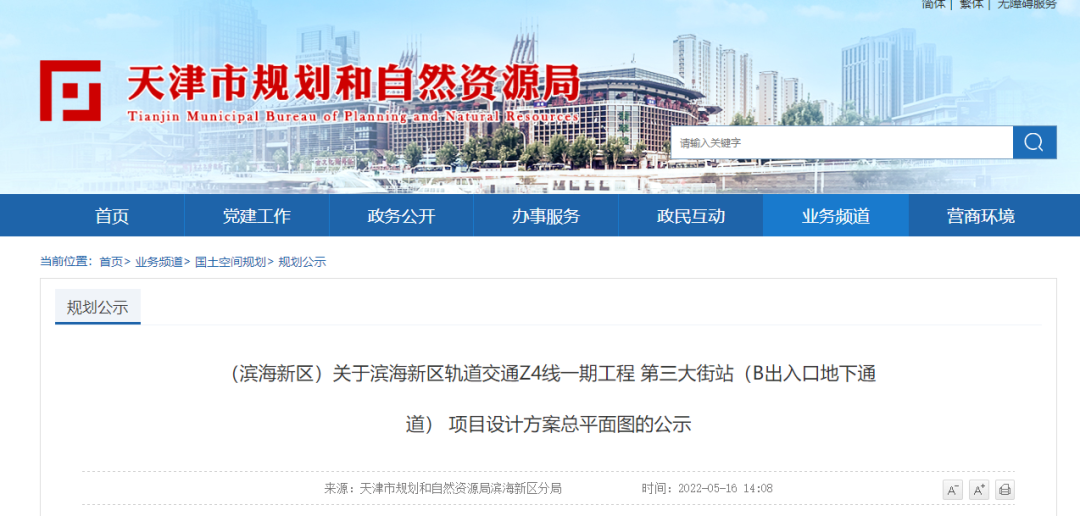 目前,滨海新区轨道交通Z4线一期工程第三大街站(B出入口地下通道)项目设计方案总平面图正在进行公示。