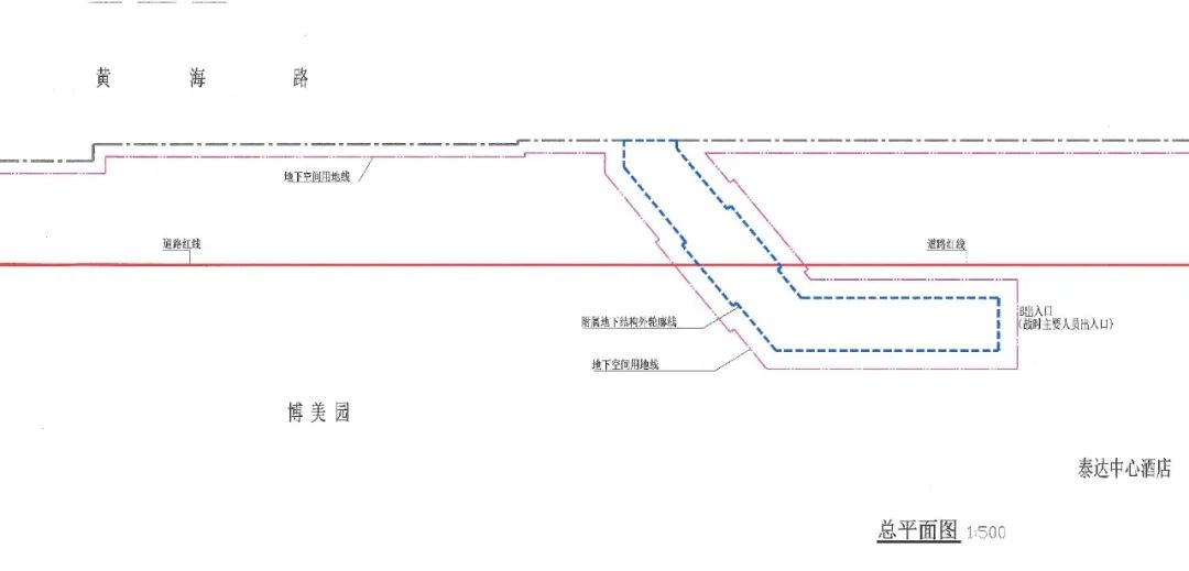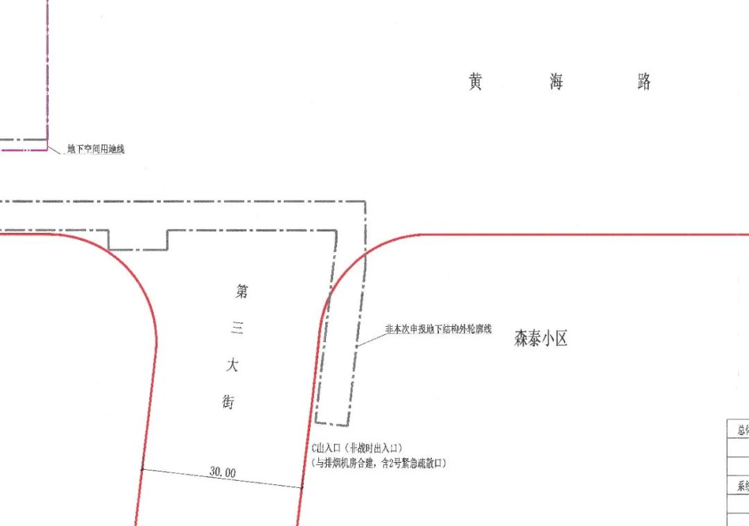 车站所在的南北向黄海路道路红线宽50m,现状道路宽40m,为双向6车道,为城市主干道;东西向第三大街道路红线宽30m,现状道路宽15m,为双向4车道。本站共设置4个出入口,2个紧急疏散口。B出入口设置在黄海路东侧泰达中心酒店的空地内。